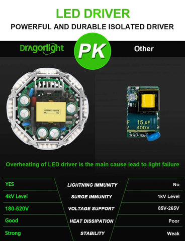 US Design with 2024 Upgraded LED technology. Full Aluminum-plated housing with strong isolated LED driver. Fanless design with fast heat dissipation, slim body with diamond PC lampshade. Good for totally enclosed and open luminaries in totally quiet operating.