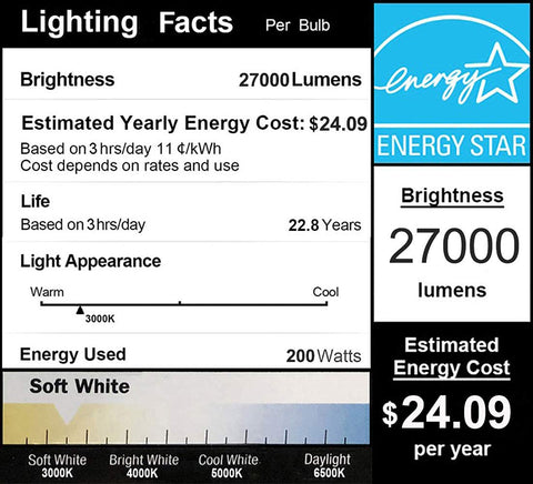 Super bright with 135lm/w high watt to lumen efficacy,create a stunning 27000 lumens brightness output with 200W LED.Replacement 800W-1000W Metal Halide/HID/HPS by saving over $90 electricity per year,the energy savings will actually pay for the bulb.