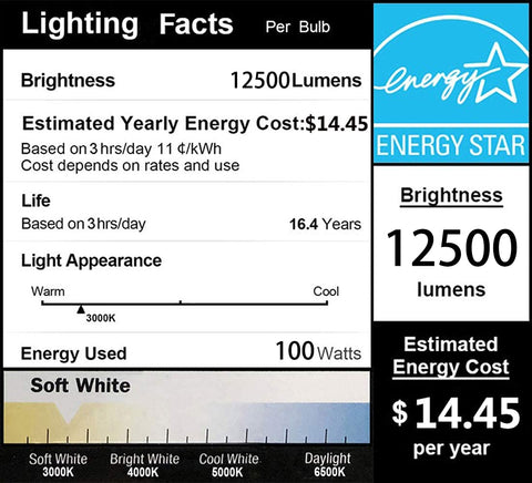 - Super bright with 125lm/w high watt to lumen efficacy, 576pcs of Epistar LED chips create stunning 12,500 lumens output with only 100 Watt LED. Replacement 300W-400W Metal Halide/HID/HPS by saving over $60 electricity per year, the energy savings will actually pay for the bulb.