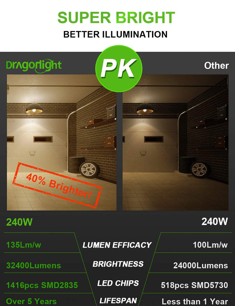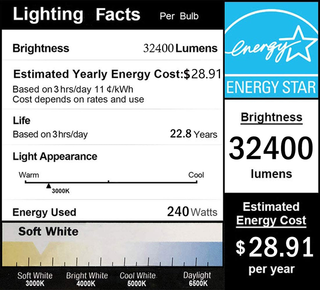 - Super bright with 135lm/w high watt to lumen efficacy, 1416pcs of Epistar LED chips create stunning 32,400 lumens output with only 240 Watt LED. Replacement 1000W Metal Halide/HID/HPS bulbs by saving over $100 electricity per year, the energy savings will actually pay for the bulb.