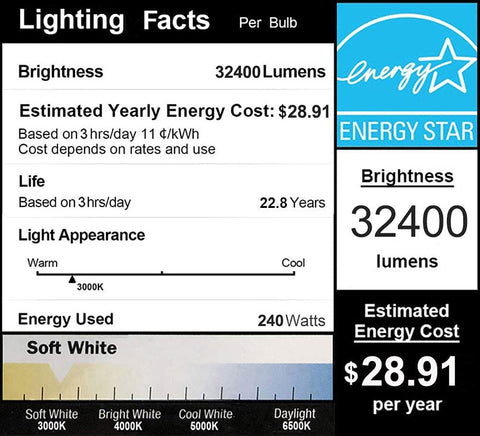 Super bright with 135lm/w high watt to lumen efficacy, create a stunning 32,400 lumens brightness output with 240W LED. Replacement 1000W Metal Halide/HID/HPS by saving over $100 electricity per year, the energy savings will actually pay for the bulb.
