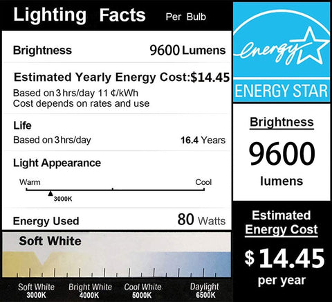 - Super bright with 120lm/w high watt to lumen efficacy, 480pcs of Epistar LED chips create stunning 9,600 lumens output with only 80 Watt LED. Replacement 600W incandescent bulbs by saving over $50 electricity per year, the energy savings will actually pay for the bulb.